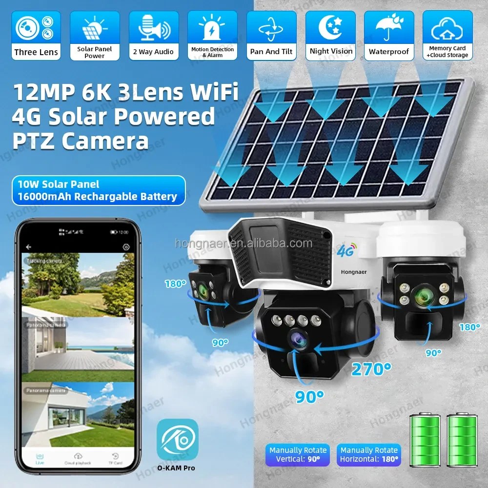 سیستم نظارتی مستقل با سه لنز واقعی (3لنز متحرک)، چرخش افقی ۳۵۵ درجه و عمودی ۹۵ درجه، دید در شب رنگی و مادون قرمز تا ۶۰ متر، پنل خورشیدی با باتری داخلی ۱5۰۰۰ میلیآمپر، قابل شارژ حتی در روزهای ابری، انتقال صدا دو طرفه, ساپورت مموری تا 128 گیگ، تشخیص حرکت هوشمند و تعقیب سوژه (Motion Track)امکان فعالسازی آژیر هشدار